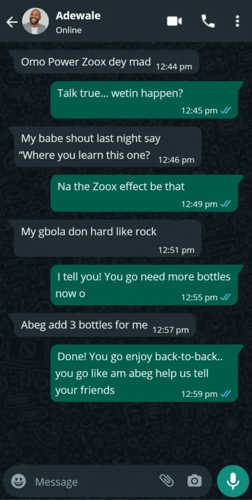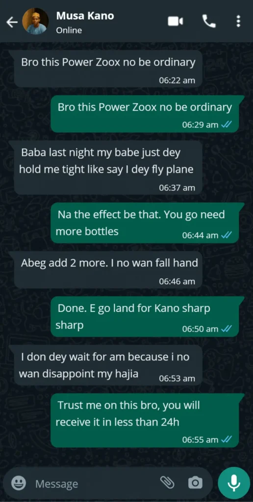 Power Zoox is not your regular agbo wey dey burn belle and make person purge. This one na pure herbal formula wey combine ancient African roots and modern potency science to transform your sexual performance.